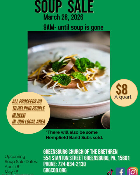 The Disciples’ Hands Ministry is having a Soup Sale on Saturday, March 28, from 9AM til all the soup is gone. A large variety of soups for $8 a qt. There will be Hempfield Band Subs available for purchase as well. First come, first served. All proceeds go to helping people in need in our area.